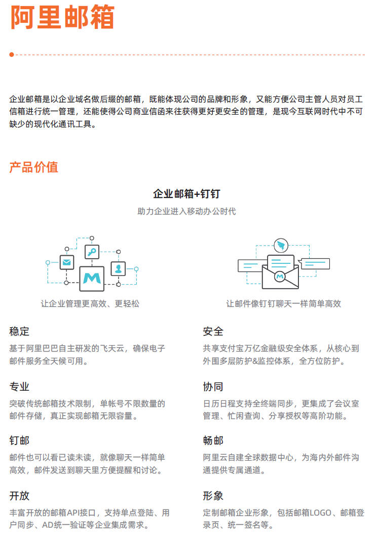 阿里企业邮箱是阿里云自主研发,基于阿里云基础组件部署,业内唯一基于云计算原生公有云服务的邮件运营商,拥有与支付宝同等级的安全攻防体系,有着20年运营经验,每用户不限容量,多终端支持,钉+邮随时随地轻松办公。